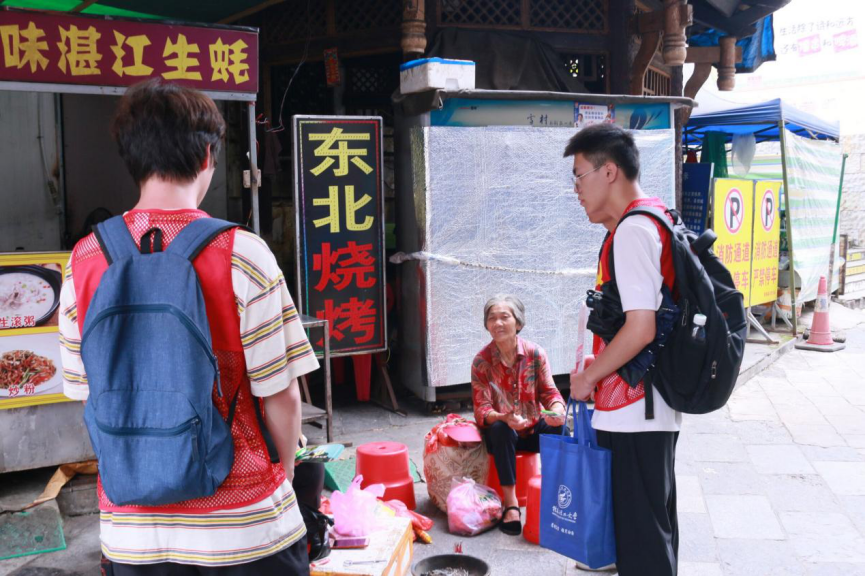 图为实践团队成员在与阳朔当地居民奶奶谈论游客使用普通话的情况。