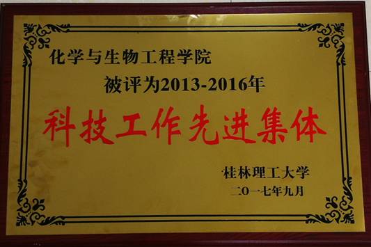 在2013-2016年间,我司获得了“电磁化学功能物质”广西区重点实验室(2014年8月)、食品安全与检测广西高校重点实验室(2014年4月)、现代食品安全检测技术广西高校高水平创新团队(2014年7月)、食品安全检测广西自然科学基金创新团队(2015年9月)等一批科研平台;获广西自然科学技术奖二等奖1项、三等奖1项;获国基自然科学基金资助项目26项,“863”子项目、省部级基金项目、广西科技开发项目50多项,实际到位科研经费达2500多万元;发表学术论文500多篇,其中SCI、EI、ISTP等三大检索收录学术论文200余篇;获授权专利120多项。发表的SCI论文引用率位居学校前列。